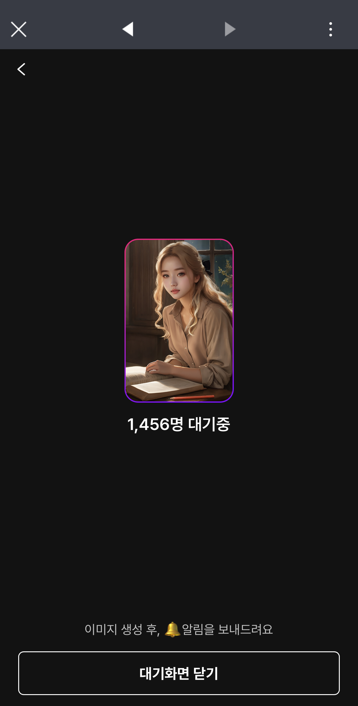 화면을 종료해도 메인화면에서 볼 수 있으니 안심하시고 창 닫고 볼일 보다가 알림이 오면 본인의 순정만화주인공이 된 얼굴을 확인하시면 됩니다