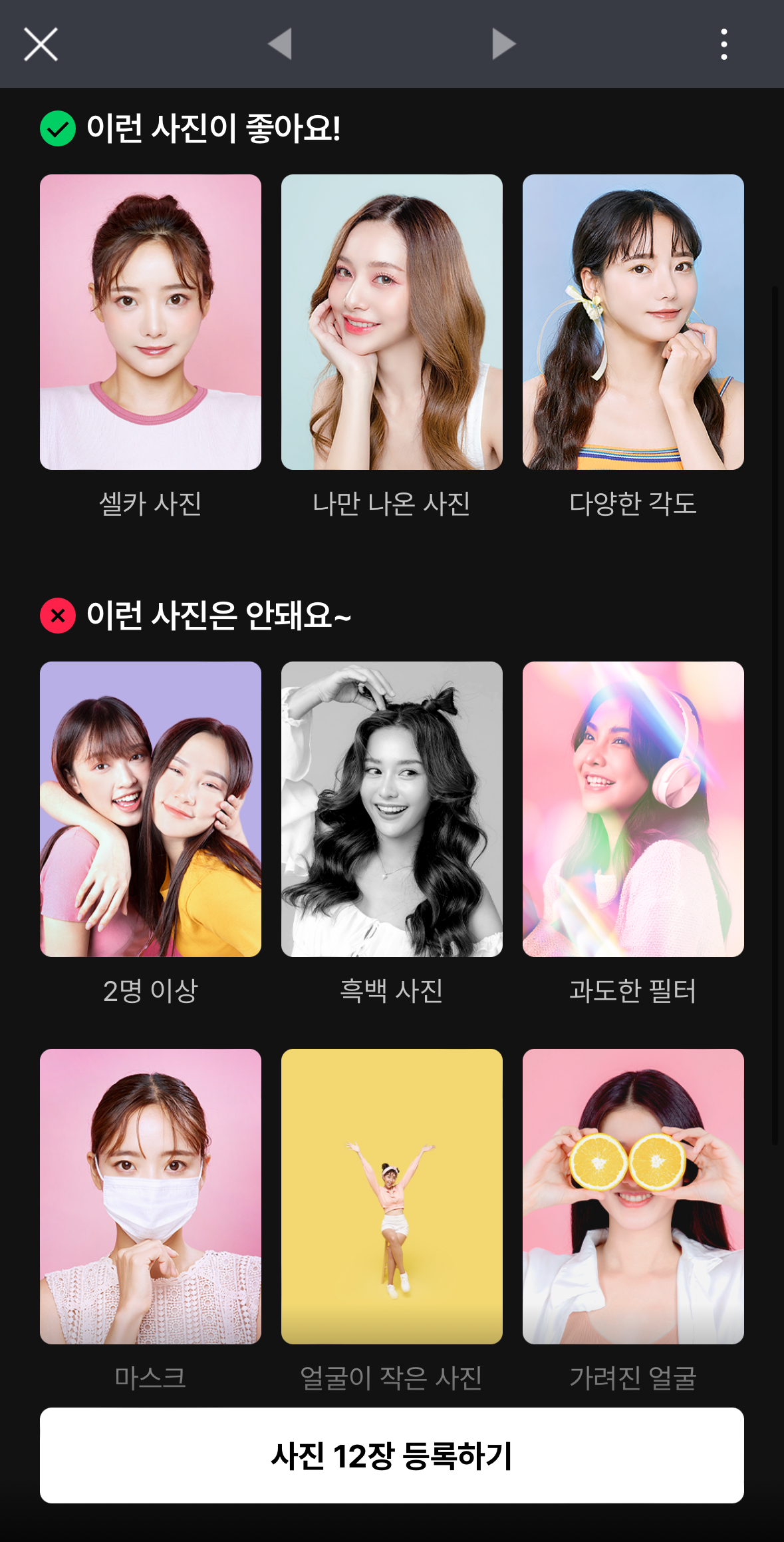 본인 얼굴 사진 12장을 등록합니다.