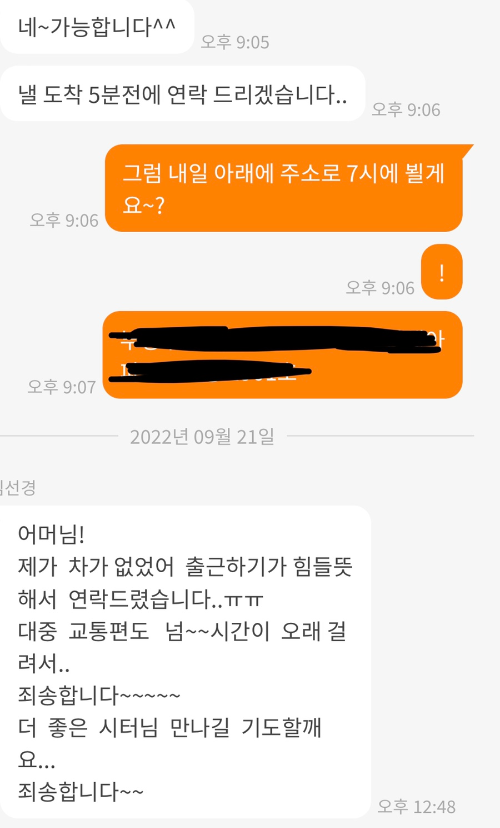 다음날 오후 12:48분에 못 온다고 연락 옴