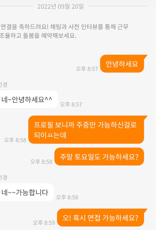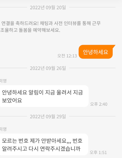9월 20일 날 채팅을 처음 주고받았고