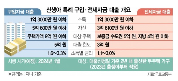 2024년 1월 29일부터 신생아를 출산하는 가정에 신생아 특례대출 제도가 도입됩니다. 2년 이내에 출산하고 무주택 및 1 주택자 그리고 부부합산 연 소득이 1.3억 원 이하인 가구까지 특례대출을 이용할 수 있습니다.