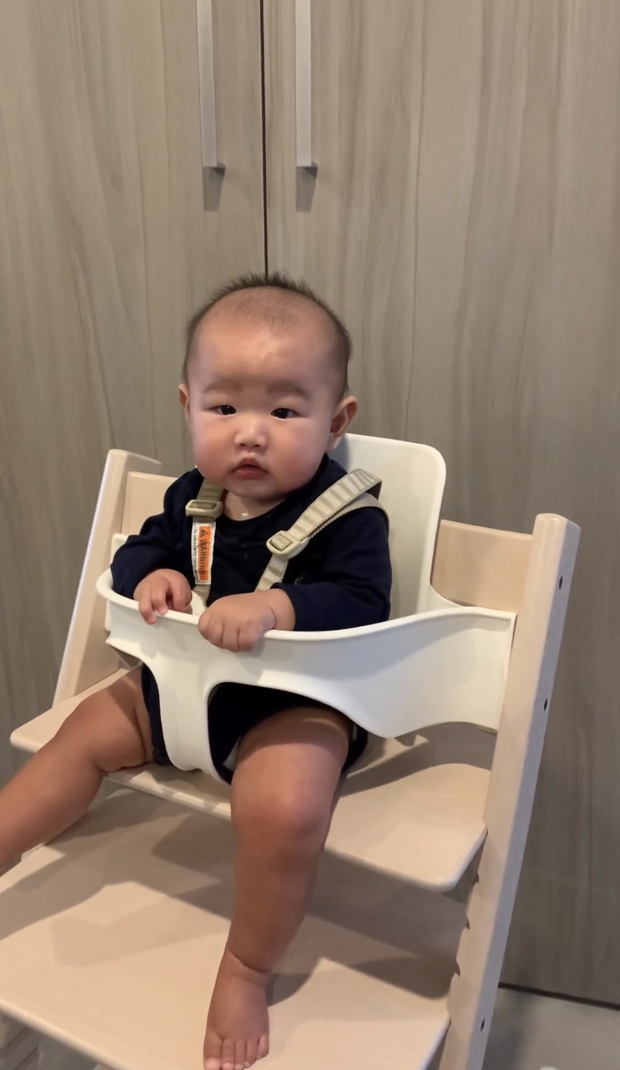 아기가 발판에 발을 내려놓으면서