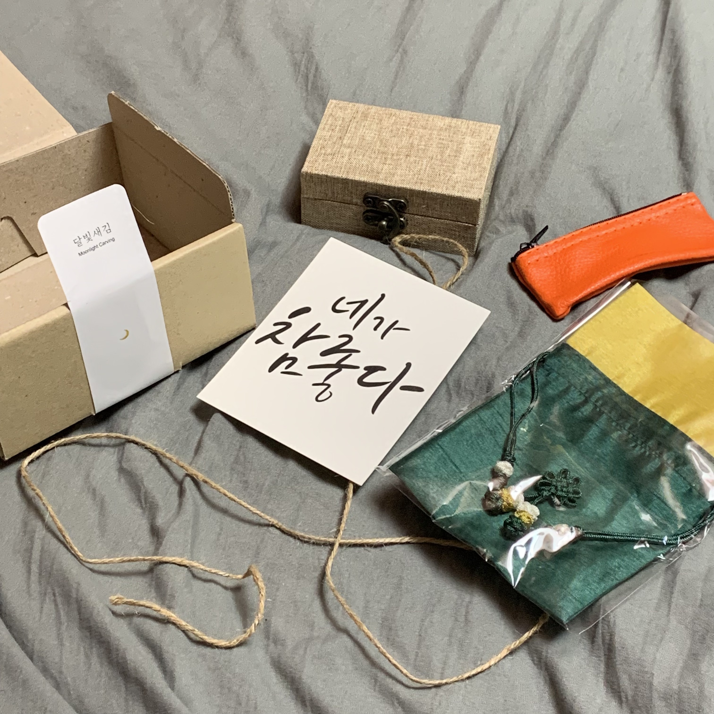오른쪽에 있는 복주머니랑 도장지갑이 선물로 온 거고
