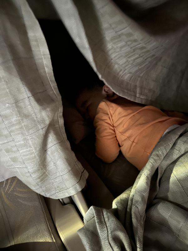 여분의 블랭킷으로 어둡게 해 주니 아이가 금방 낮잠이 들었어요.