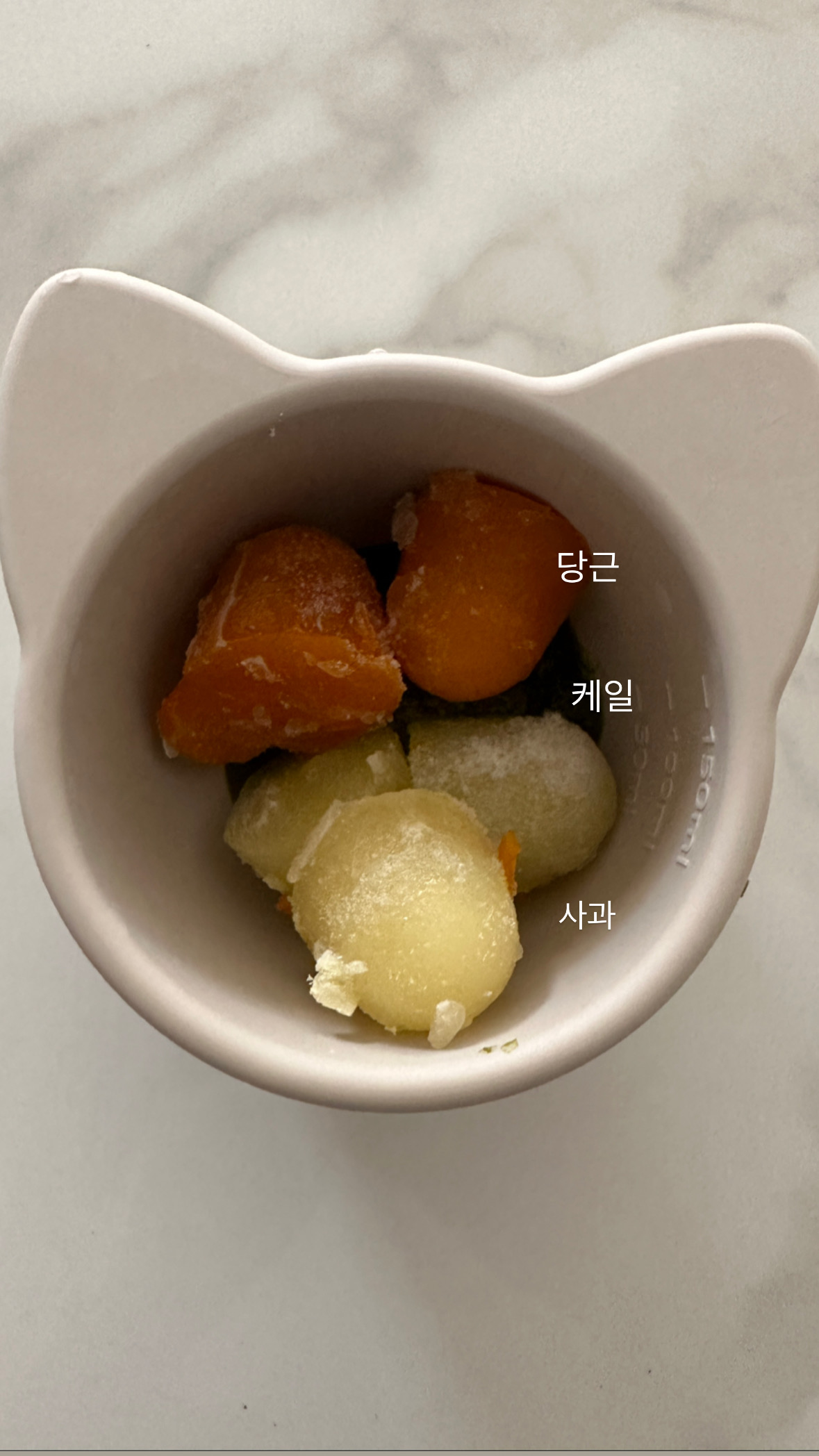 이유식 : 사과 40g + 케일 30g + 당근 20g