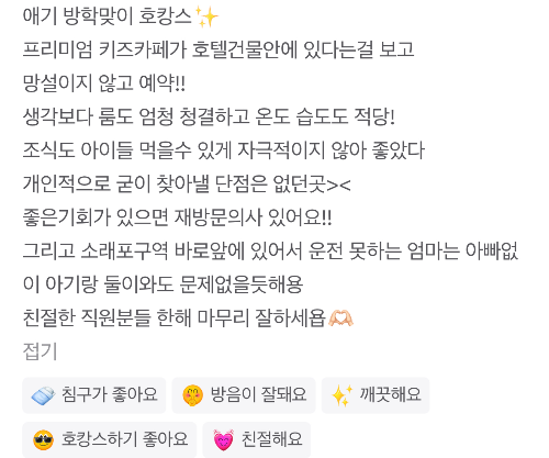- 실내 키즈 플레이존 및 야외 액티비티 공간 보유