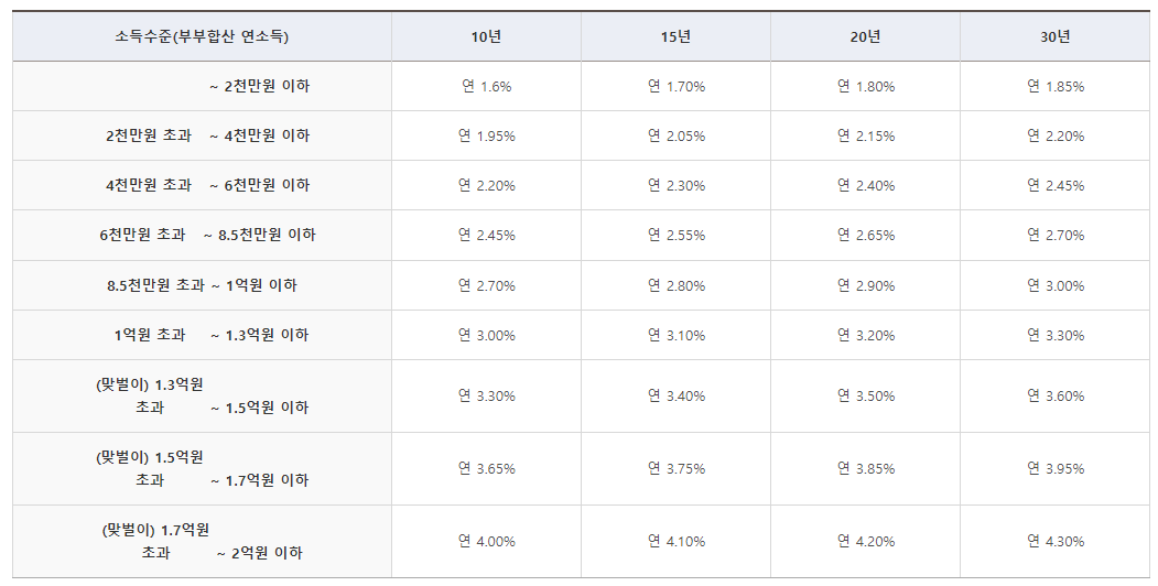 대출 대상: 부부합산 연소득 1.3억원 이하 혹은 맞벌이의 경우 2억원 이하, 순자산가액 4.69억원 이하